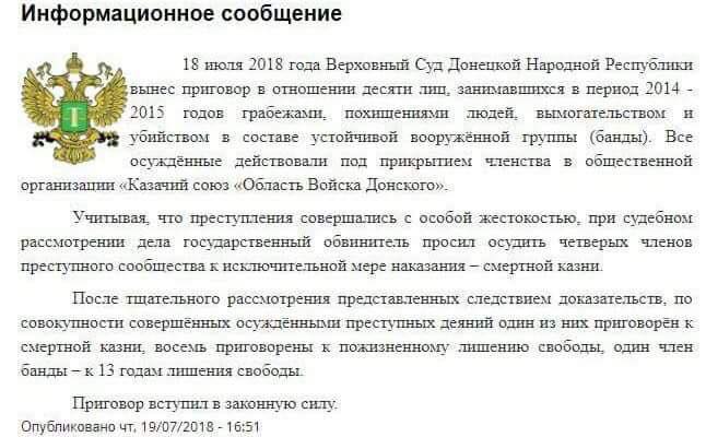 Отметим, что "Казачий союз" был насильно разоружен представителями "ДНР" в 2015 году, в ходе ликвидации самостоятельных военных формирований, которые не подчинялись центральной власти сепаратистов.