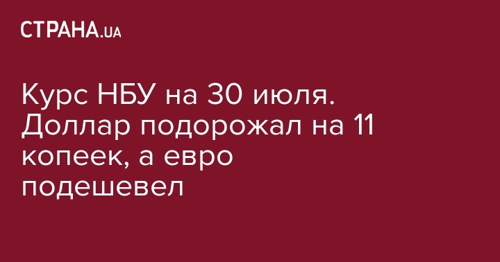 В понедельник, 30 июля, курс доллара вырос на 11 копеек, а курс европейской валюты на столько же снизился. Об этом сообщается на сайте НБУ.