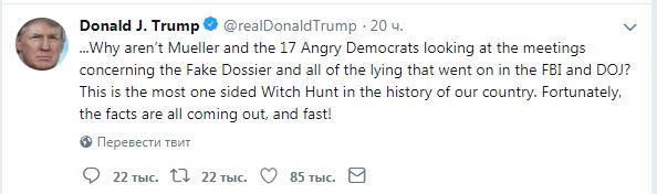 Трамп также заявил о фейковом досье и назвал расследование о вмешательстве России в американские выборы 2016 года "крупнейшей охотой на ведьм в истории США".
