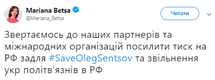 Также Марьяна Беца обратилась к партнерам Украины и международным организациям с просьбой усилить давление на РФ для освобождения Сенцова и других украинских политзаключенных в России.