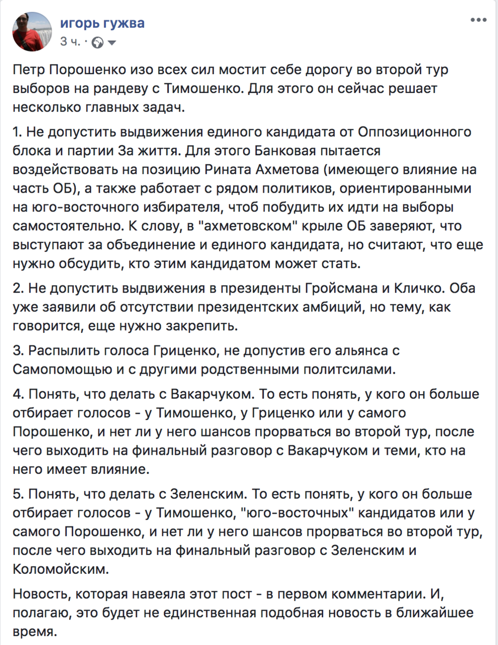 4. Понять что делать с Вакарчуком. То есть понять, у кого он больше отбирает голосов - у Тимошенко, у Гриценко или у самого Порошенко, и нет ли у него шансов прорваться во второй тур, после чего выходить на финальный разговор с Вакарчуком и теми, кто на него имеет влияние.