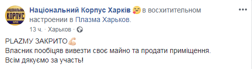 Вечером в воскресенье, 24 сентября, в Харькове члены "Нацкорпуса" ("Азов") заблокировали ночной клуб "Плазма" из-за того, что он якобы "мешал местным жителям". Его владелец "пообещал, что продаст здание". Об этом сообщается на странице Нацкорпуса в Facebook.
