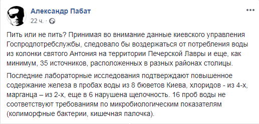 Вода в бюветах Киева может быть не просто невкусной, но и опасной для здоровья. Об этом идет речь в результатах лабораторных исследований, которые на своей странице в Facebook опубликовал депутат Киевского совета Александр Пабат.