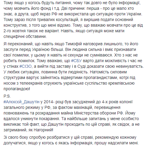 Он также приводит текст решения суда о мере пресечения для Нагорного. Печерский суд Киева 4 октября избрал ему содержание под стражей с правом выйти под залог 528 600 грн.