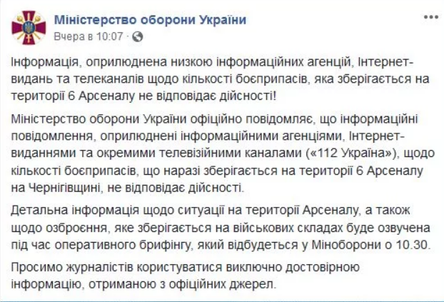 "Министерство обороны Украины официально сообщает, что информационные сообщения, опубликованные информационными агентствами, интернет-изданиями и отдельными телевизионными каналами ("112 Украина") относительно количества боеприпасов, хранящихся на территории 6-го арсенала на Черниговщине, не соответствуют действительности", - говорится в посте Минобороны.