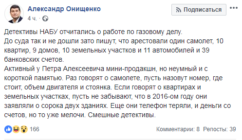 Детективы НАБО отчитались о работе по газовому делу Александра Онищенко. Об этом нардеп сообщил на своей странице в Facebook.