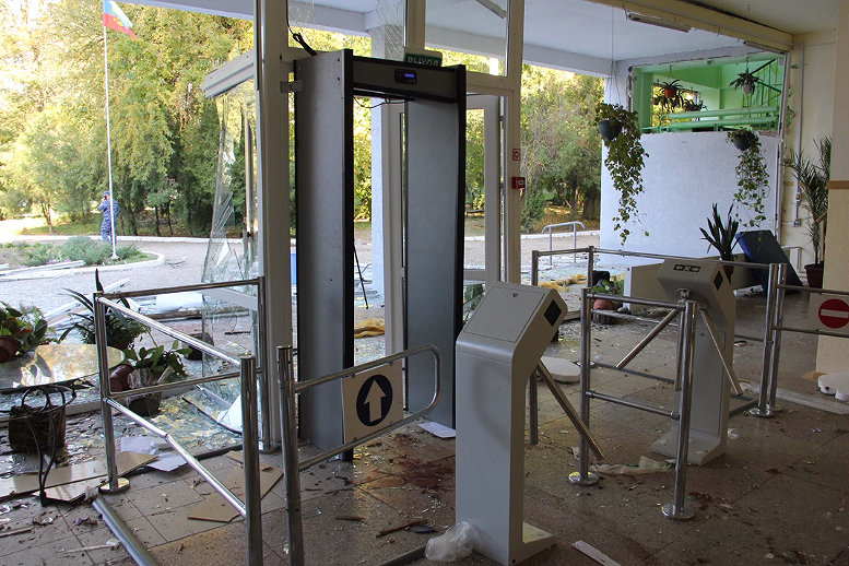 Серьезный ремонт потребуется везде: в фойе отсутствуют стекла, повалены вазоны. На полу, стенах - следы крови.