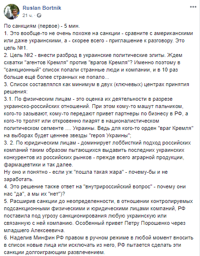Волонтер Юрий Касьянов написал, что санкции раскололи украинский политикум. "Украинский политикум раскололся на тех, кто горячо поддерживает санкции России, потому что их в санкционные списки включили. И на тех, кто категорически не приемлет очередной диктат Кремля, не внёсшего их в санкционные списки. Уже звучат обвинения в подтасовке и коррупции. Говорят, Медведеву лично заносили... Так же недавно было и с расстрельным "списком Бабченко", когда возмущались те, кому не дали расстрел, и государственную охрану. Ведь впереди выборы, и лучше быть расстрелянным и санкционированным, чем не получить президентскую булаву или депутатский мандат".