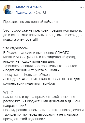 Кто ещё не в курсе — завтра Рада проголосует за бюджет на 2019 год, в котором именно такая сумма — 1 000 000 000 грн. — заложена для на скорую руку созданного "фонда Президента". Эти средства будут передаваться куда-то там в благотворительных целях из рук Семьи. Т.е. ПАП будет теперь Санта Клаусом, который должен потратит лярд грн налогоплательщиков (наших, млять, с вами!!! с вашей растаможенной "неевробляхи", например!) под видом лично своих до выборов президента на свой личный пиар, чтобы, как подтвердил недавно приближенный к тусовке, воровать ещё 5 лет: "власть вынуждена воровать".