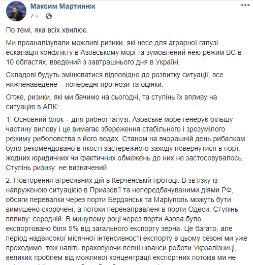 "Основной блок - для рыбной отрасли. Азовское море генерирует большую часть улова и это требует сохранения стабильного и понятного режима рыболовства в его водах. По состоянию на вчерашний день рыбакам в Азовском море рекомендовали вернуться в порт после введения военного положения, никаких юридических или фактических ограничений к ним не применялось. Степень риска: не определена", – написал он.