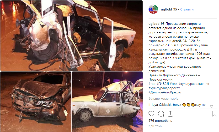 Уточняется, что ДТП произошло поздно вечером во вторник, 4 декабря, в Грозном на улице Ханкальская. На странице Управления ГИБДД Чечни в Instagram опубликованы три фотографии с места происшествия. В подписи к ним сообщается, что погибли женщина 1996 года рождения и ее трехлетняя дочь. Причиной аварии стало превышение скорости.