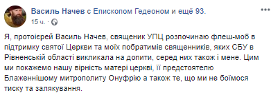 "Я, протоиерей Василий Начева, священник УПЦ начинаю флешмоб в поддержку святой Церкви и моих побратимов священников, которых СБУ в Ровенской области вызвала на допросы, среди них также и меня. Этим мы покажем нашу верность матери церкви, ее предстоятелю Блаженнейшему митрополиту Онуфрию а также то, что мы не боимся давления и запугивания", - написал в соцсети протоиерей Василий Нечаев.