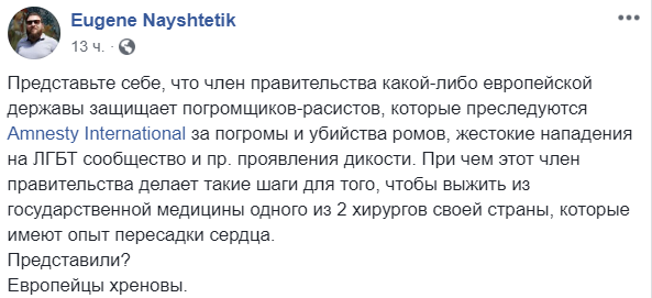 "Представьте себе, что член правительства какой-либо европейской державы защищает погромщиков-расистов, которые преследуются Amnesty International за погромы и убийства ромов, жестокие нападения на ЛГБТ сообщество и пр. проявления дикости. При чем этот член правительства делает такие шаги для того, чтобы выжить из государственной медицины одного из 2 хирургов своей страны, которые имеют опыт пересадки сердца.