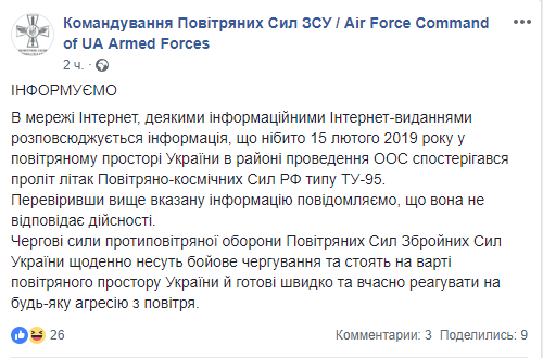 Воздушные силы Вооруженных сил Украины объявляют, что воздушная граница страны не была нарушена российскими самолетами. Об этом сообщается на официальной странице командование в Facebook.