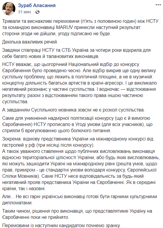 "Продолжительные и изнурительные переговоры (пять с половиной часов) между НОТУ и командой исполнительницы MARUV принесли следующий результат: стороны к согласию не пришли, соглашение подписано не будет", - заявил оню