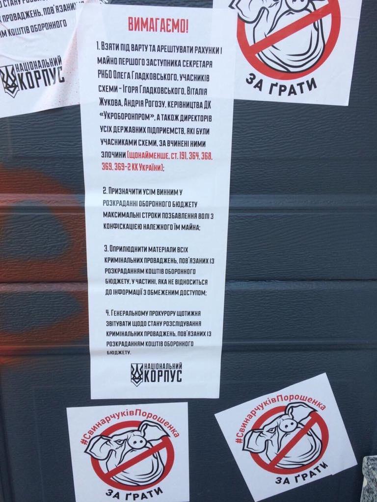 Также участники наклеили на забор список своих требований, среди которых: взять под стражу и арестовать счета и имущество первого заместителя секретаря СНБО Олега Гладковского, участников схемы - Игоря Гладковского, Виталия Жукова, Андрея Рогозу, руководство ГК "Укроборонпром", а также директоров всех государственных предприятий, которые были участниками схемы за совершенные ими преступления, как минимум: ст. 191, 364, 368, 369, 369-2 УК Украины.