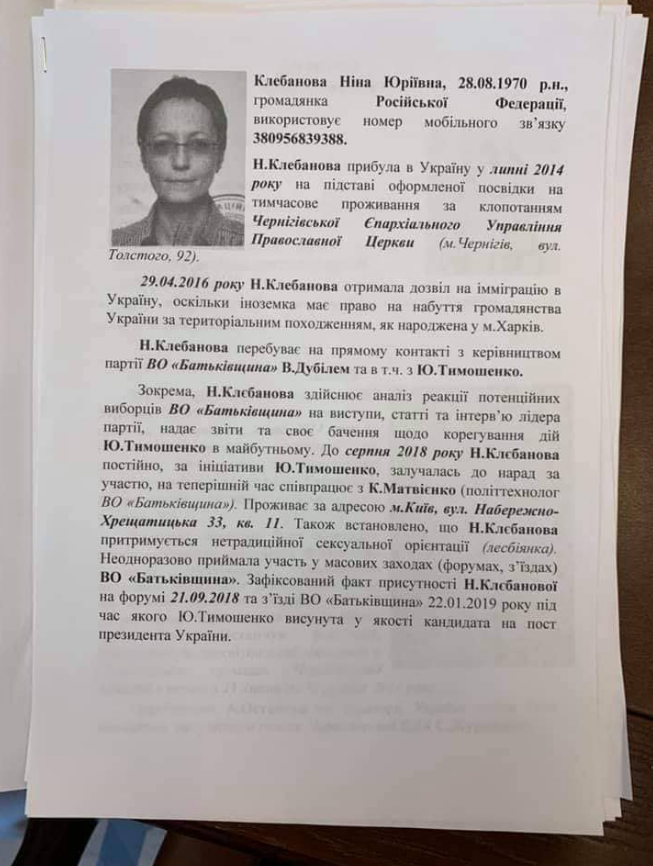 Так, оперативная справка была опубликована на гражданку Российской Федерации Клебанову Нину Юрьевну 1970 года рождения. Отметим, что в справке указывается используемый Клебановой номер телефона. Также сообщается, что Клебанова состоит на прямом контакте с руководством ВО "Батькивщина" и непосредственно с Юлией Тимошенко.