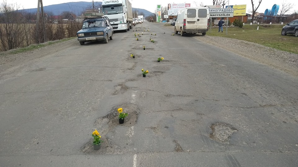 На Закарпатье к приезду Порошенко устроили флешмоб с цветами в дорожных ямах. Фото