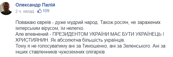 "Александр Палий, у меня к вам вопрос. Говорите, что президентом не должен быть еврей. А премьер Гройсман, бывший глава АП Ложкин и далее по списку Вам ок?