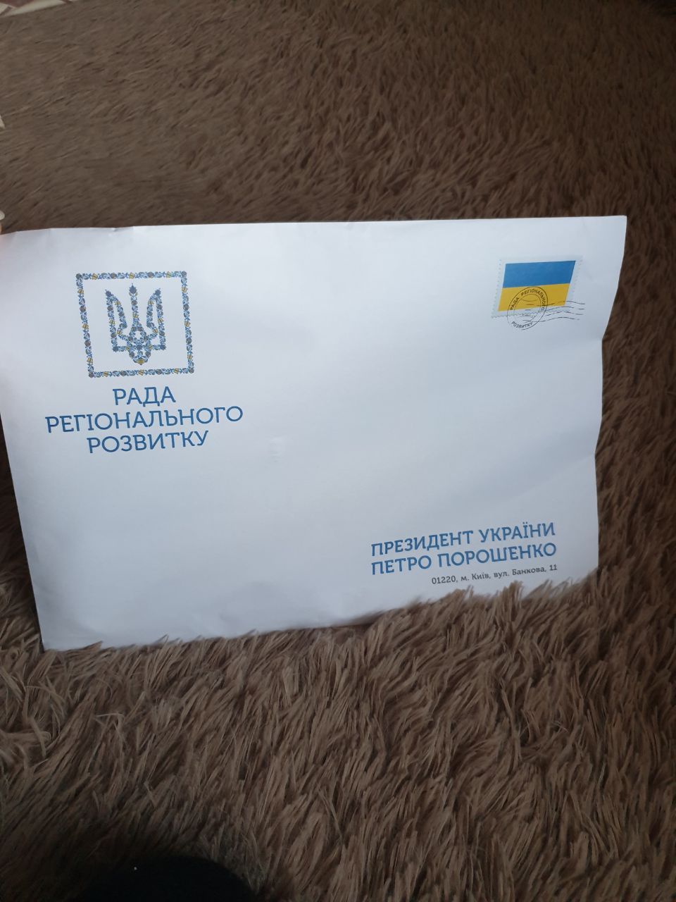 Конверты имеют разное содержимое, в зависимости от региона. На конверте отправителем значится президент Украины Петр порошенко, адрес АП, в верхнем левом углу "Рада регіонального розвитку" и герб Украины.