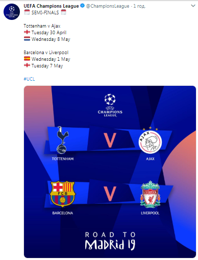 В УЕФА уже назвали даты проведения полуфиналов. Первый состоится 30 апреля. Тоттенхэм на своем поле примет Аякс. Ответная встреча этих команд пройдет 8 мая.