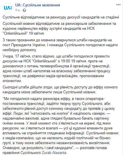 Зураб Аласания на своей странице в соцсети Facebook также сообщил, что вскоре ожидается решение ЦИК относительно изменения времени национальных дебатов с 20:00 до 21:00 (как сейчас) на один час позже, то есть с 21:00 до 22:00. Это необходимо, чтобы Порошенко с Зеленским могли после мероприятия на стадионе проехать в студию Общественного и поучаствовать в теледебатах, как это предусмотрено в законодательстве.