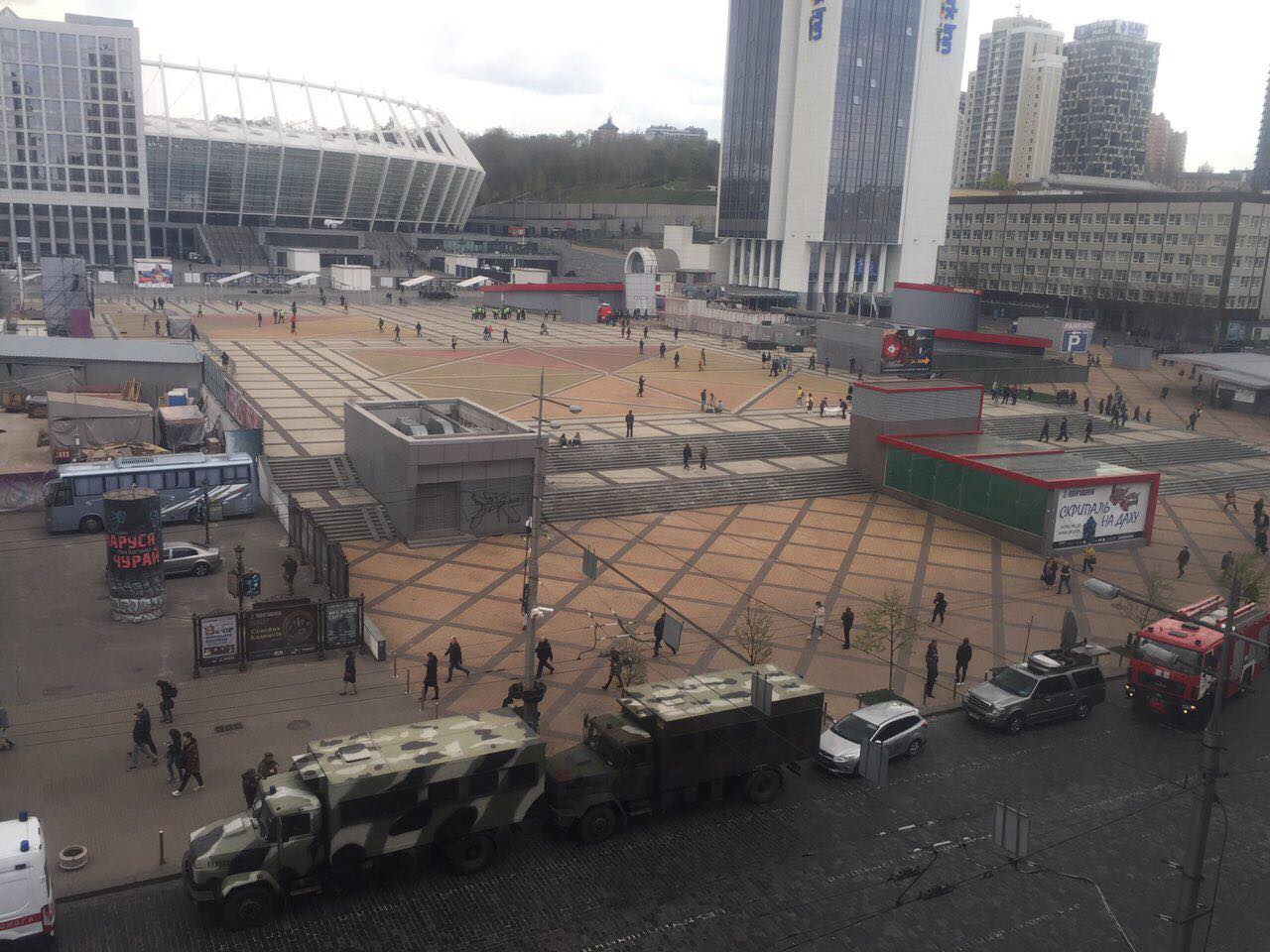 Вот так выглядела площадь перед стадионом по состоянию на 12:50. Там военные грузовики, пожарные и скорые.