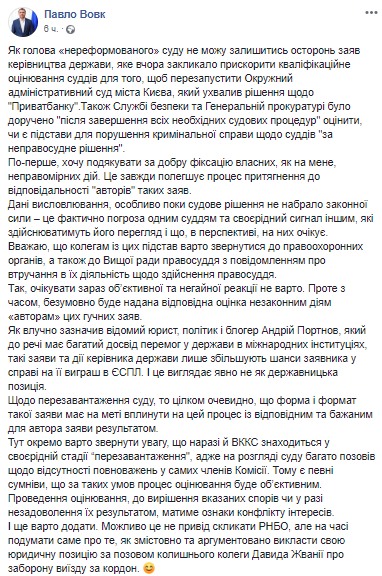 "Как глава "нереформированного" суда не могу остаться в стороне заявлений руководства государства, которое вчера призвало ускорить квалификационное оценивание судей для того, чтобы перезапустить Окружной административный суд г.Киева, который принял решение о ПриватБанке. Также Службе безопасности и Генеральной прокуратуре было поручено "после завершения всех необходимых судебных процедур "оценить, есть ли основания для возбуждения уголовного дела в отношении судей" за неправосудное решение… Данные высказывания, особенно пока судебное решение не вступило в законную силу – это фактически угроза одним судьям и своеобразный сигнал другим, которые будут осуществлять его просмотр, что в перспективе, их ожидает", - написал Павел Вовк.
