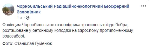 "Специалистам Чернобыльского заповедника попалось гнездо бобра, расположенное в бетонном колодце на заросшем противопожарном водозаборе", - говорится в сообщении.