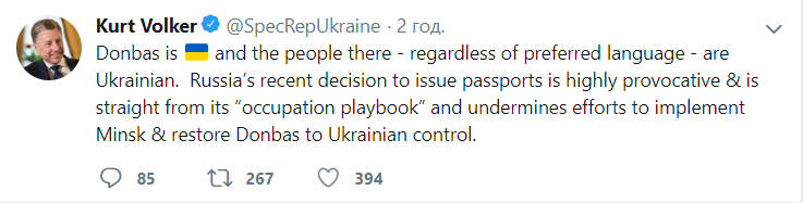 "Это решение России по выдаче паспортов носит провокационный характер и взято из "оккупационного плана", оно подрывает попытки имплементировать минские договоренности и вернуть Донбасс под контроль Украины", - написал он в Twitter.