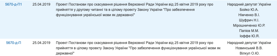 Так, Новинский и Бойко зарегистрировали два проекта постановления об отмене решения Рады о принятии закона "Об обеспечении функционирования украинского языка как государственного". №5670-д-П и №5670-д-П1.