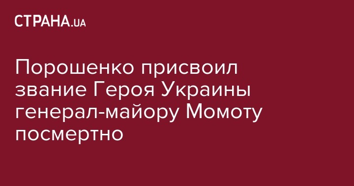Президент Украины Петр Порошенко присвоил звание Героя Украины с вручением ордена "Золотая Звезда" генерал-майору Игорю Момоту посмертно. Об этом сообщается на сайте президента Украины в пятницу.