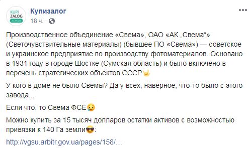 В соцсетях уже отреагировали на новость о продаже. "У кого в доме не было Свемы? Да у всех, наверное, что-то было с этого завода...Если что, то Свема ФСЁ. Можно купить за 15 тысяч долларов остатки активов с возможностью привязки к 140 Га земли. Нужно, конечно, все изучать...", - пишет группа Купизалог в Facebook.