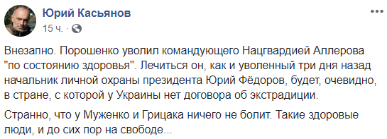 "Внезапно. Порошенко уволил командующего Нацгвардией Аллерова "по состоянию здоровья". Лечиться он, как и уволенный три дня назад начальник личной охраны президента Юрий Фёдоров, будет, очевидно, в стране, с которой у Украины нет договора об экстрадиции.