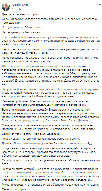 "Общаясь в селе с местными жителями, нас, помимо всего прочего, попросили установить банкомат. Мы в принципе не банк, но когда в небольших населенных пунктах видят сотрудников ОГА, которые до нас не баловали своим вниманием любые села и города, расположенные за вывеской Днепр, мы всегда стараемся помочь. Даже когда вопрос явно не наш. Попросили банк установить там банкомат. Банк откликнулся на нашу просьбу. В село поехали его сотрудники. Вернулись вечером слегка ошалевшие. За аренду места под банкомат местный предприниматель попросил сумму, сопоставимую с той, которую банк платит за аренду места под банкомат в Мост-Сити (торговый комплекс в центре города - Прим. Ред.) в Днепре. С владельцами помещения вступили в переговоры с помощью главы местной ОТГ. Не сразу, но цена аренды стала более-менее вменяемой. Банкомат установили. Люди были довольны. Почему были? Потому что сегодня ночью банкомат сожгли", - написал в соцсети Юрий Голик.