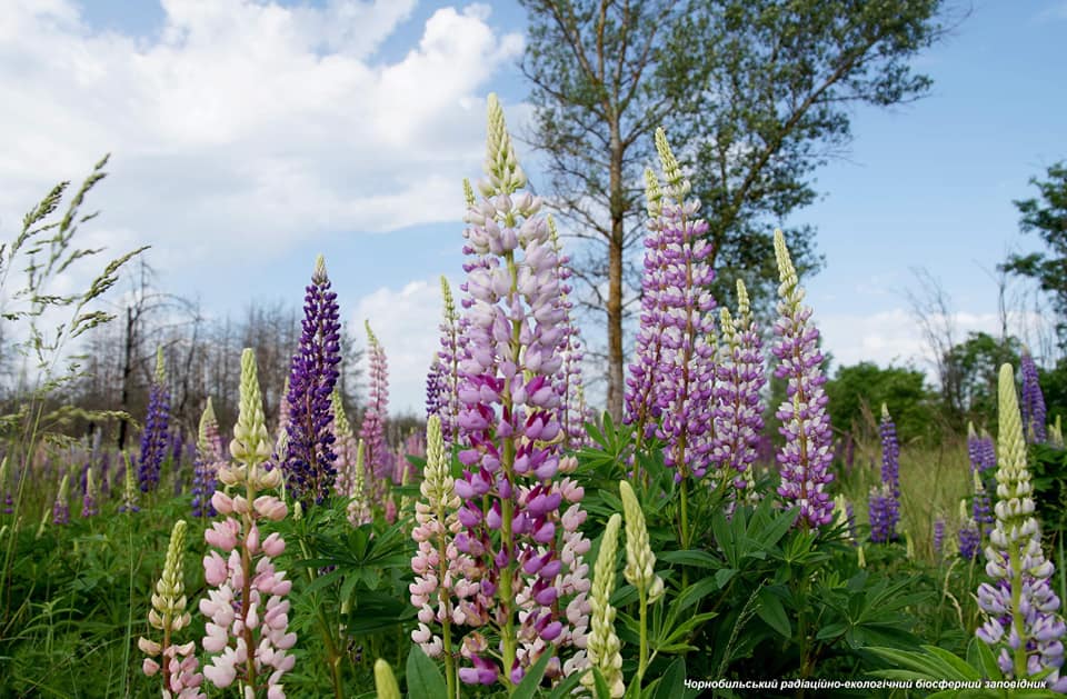 На третьем и четвертом фото - поляна люпина. Это растение семейства бобовых, его еще называют "волчий боб". Интересно, что в цветках люпина содержится около 50% белка, 20% масла, которое по качеству близкое к оливковому. Несмотря на то, что семена люпина с древних времен используется в пищу человеком и на корм животным, данные цветки нельзя использовать из-за произрастания в радиационном фоне.