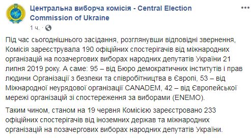 Таким образом, по состоянию на 19 июня Комиссия зарегистрировано 233 официальных наблюдателей от иностранных государств и международных организаций на внеочередных выборах народных депутатов Украины.
