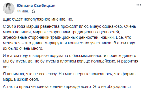 "Пока это лучшая фотография с Марша равенства. П.С. Смотрю, что в ленте от КиевПрайда у многих знатно подгорает. Штош, все они немного Мосийчук", - написал блогер Владимир Попов.