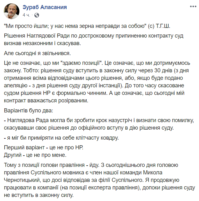 19 июня Шевченковский райсуд столицы отменил решение наблюдательного совета НОТУ относительно увольнения Зураба Аласании с должности главы общественного вещателя.