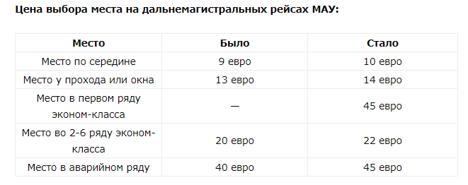 Отметим, что сейчас диапазон цен за выбор или изменение места находится в пределах 4-12 евро для внутренних рейсов, 5-16 евро для среднемагистральных рейсов и 10-45 евро для дальнемагистральных рейсов.