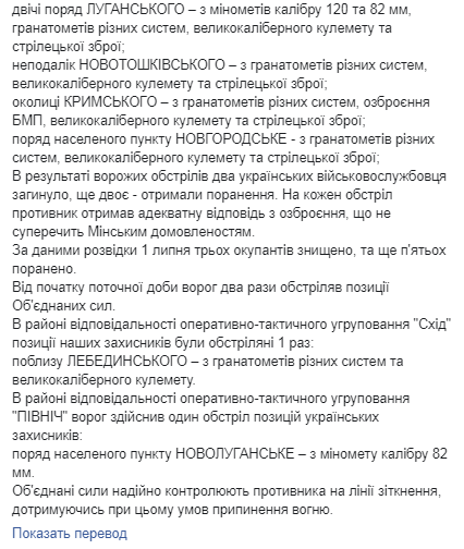 В понедельник, 1 июля, в зоне ООС противник 25 раз нарушил режим прекращения огня, в результате погибли двое украинских военных. Об этом сообщает пресс-центр Штаба ООС на странице в Facebook.