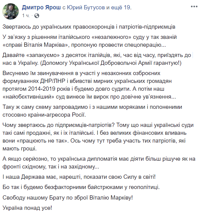 Глава "Украинской добровольческой армии" Дмитрий Ярош призвал захватывать граждан Италии для обмена на Маркива.