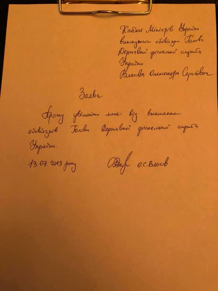 И.о. глава ГФС Власов, как и обещал Зеленскому, таки подал в отставку. Документ