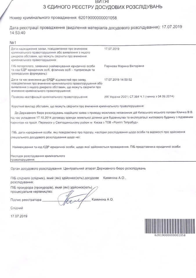 "ГБР начало расследование по нашему первому заявлению о преступлении по земельным махинациям Виталия Кличко. Сегодня опубликуем второе", - написала она.