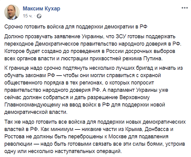 По словам журналиста, Украина должна заявить, что ее вооруженные силы готовы поддержать "переходное Демократическое правительство народного доверия в РФ". По мнению Кухаря, такое правительство будет создано до проведения в России досрочных выборов всех органов власти и люстрации "прихвостней режима Путина".