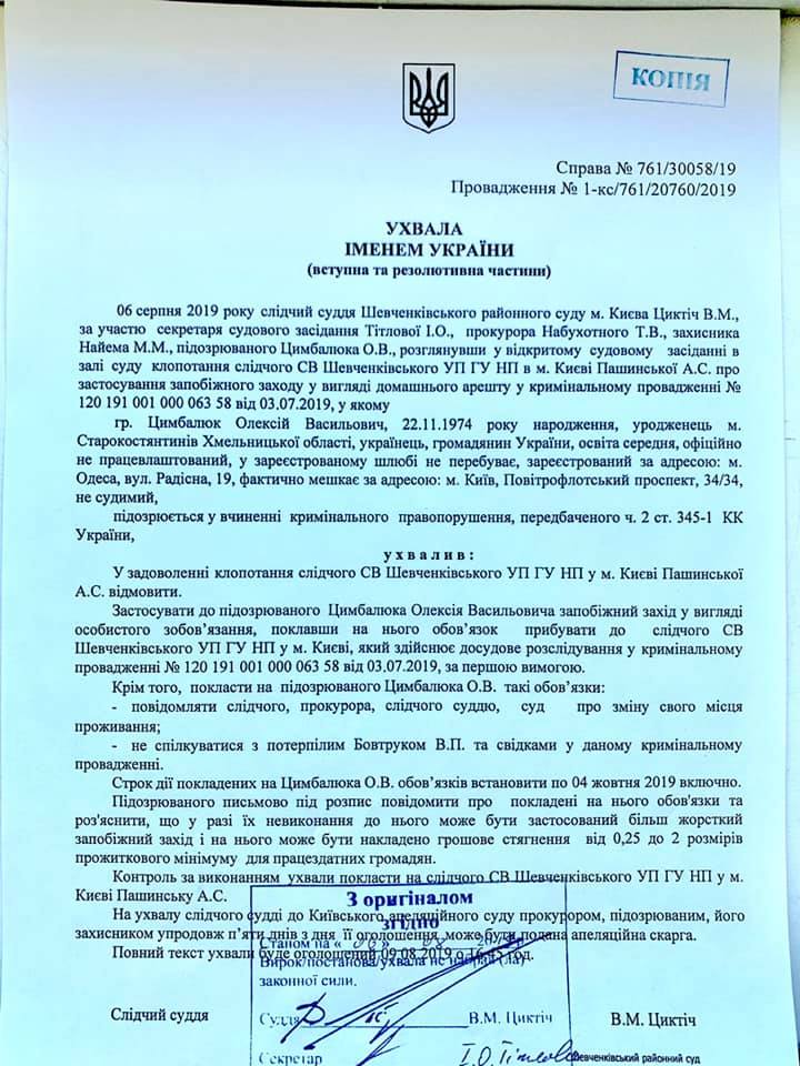 2 августа заседание перенесли из-за того, что адвокат Цымбалюка Маси Найем заявил ходатайство об отводе следственного судьи Виталия Циктича. Суд отложили до момента решения вопроса с отводом. А сегодня, 6 августа, Шевченковский райсуд отклонил ходатайство об отводе судьи и назначил заседание.