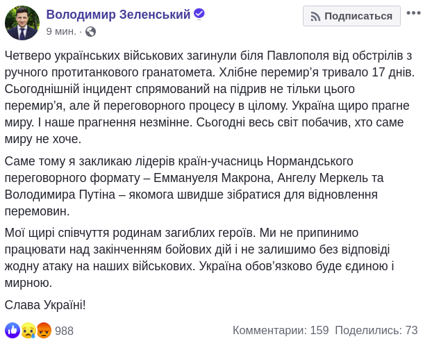 "…я призываю лидеров стран-участниц Нормандского переговорного формата - Эмманюэля Макрона, Ангелу Меркель и Владимира Путина - как можно быстрее собраться для возобновления переговоров", - написал Зеленский, сопроводив свои слова выражением "Слава Украине".