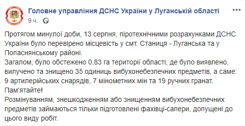 Саперы продолжают проверять местности в пгт Станица Луганская на наличие мин. За минувшие сутки пиротехниками было обнаружено и деактивировано 35 взрывоопасных предметов, сообщает управление ГСЧС в Луганской области на своей странице в Facebook в среду, 14 августа.