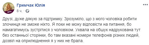 Также она сказала, что пока не известно, где находится Грымчак. По словам Матяш, его вместе с помощником Игорем Овдиенко должны были доставить в изолятор временного содержания, но адвокат не знает, произошло ли это.