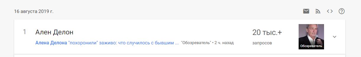 16 августа самым популярным запросом в Google в Украине по версии Google Trends стал "Ален Делон" и "Ален Делон умер". Сегодня внезапно им интересовались тысячи пользователей. При этом новость о смерти звезды французского кино в СМИ не появлялась.